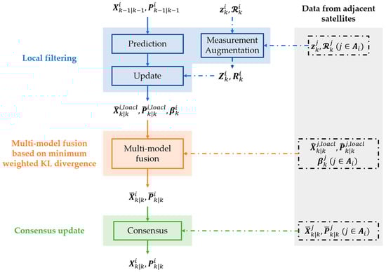 In the FDMM algorithm, a novel distributed multi-model fusion framework is adopted to assign the computational tasks of MM filtering to each satellite. Unlike the framework in [,], where each node performs multiple filtering based on multiple-motion models, the FDMM algorithm allows each satellite to perform local filtering based only on a single but different motion model. After local filtering, the local estimates of each satellite are diffused to adjacent satellites, and then multiple-model fusion is performed on the obtained results in each satellite.