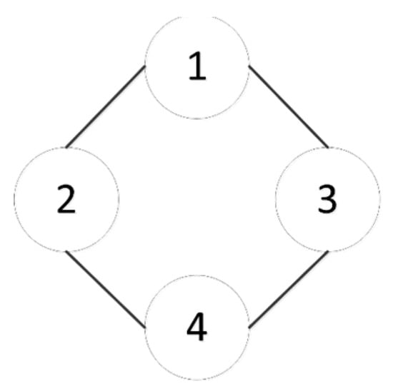 At time , the communication protocol between satellite and its adjacent satellite, , is set as the Metropolis matrix, [], as shown in Equation (3):