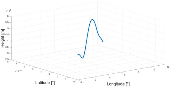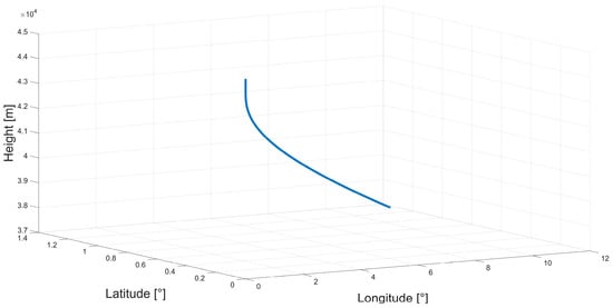 The initial position and velocity of the target in the ECI were and , respectively. The initial altitude of the target was , and the initial longitude and latitude were (0°, 0°). The trajectory is given in Figure 10.
