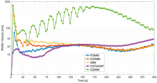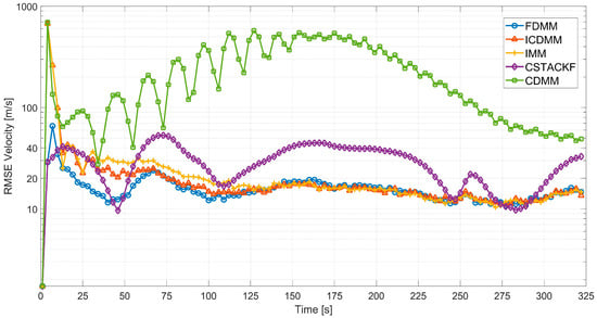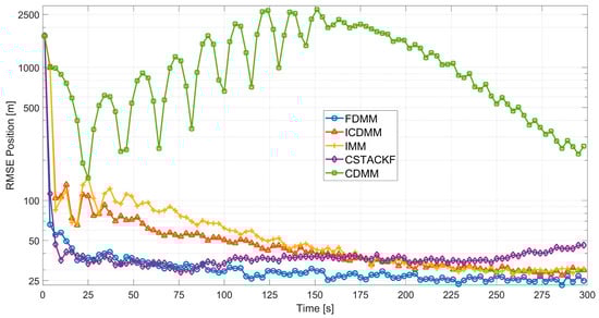 When tracking the non-cooperative target in the skip-gliding mode, the position RMSE and the velocity RMSE of the CSTACKF algorithm were not stable, as can be seen in Figure 11 and Figure 12. The CSTACKF algorithm took a single model, which mismatched the motion of the target. Affected by the skip-gliding maneuver of the target, it showed lower tracking process stability, and its tracking precision also fluctuated up and down. As there was no adaptive filter, the CDMM algorithm was greatly affected by the initial disturbance. In addition, the skip-gliding maneuver also made the filtering of the CDMM algorithm take a long time to converge, as shown in Figure 11, Figure 12 and Figure 14. In Case 2, the CDMM algorithm still showed the worst performance among the five algorithms.