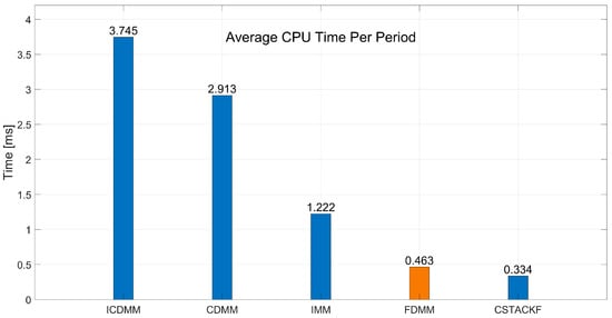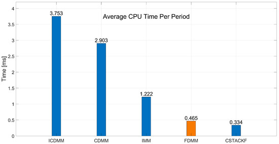 In terms of the average CPU time per period, compared to other MM algorithms, the results illustrated that the FDMM algorithm required far less computation time, as shown in Figure 8, meaning that the FDMM algorithm had far less computational complexity than other MM methods. In addition, the average CPU time of the FDMM algorithm was close to the CSTACKF, which employed a single model, proving that the new proposed distributed multi-model fusion framework in the FDMM algorithm could significantly reduce the computational complexity of the MM algorithm.