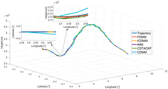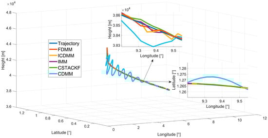 In Case 2, the proposed FDMM algorithm was also compared with the CSTACKF, the CDMM, the ICDMM, and the IMM algorithms. The initial disturbance was also given, where the position errors were and the velocity errors were . Since the target was non-cooperative, no relevant prior dynamics information could be obtained, to build an accurate motion model for the tracking algorithm. To verify the robustness of these tracking algorithms, the same set-up as in Case 1 was used in each multiple-model algorithm, despite tracking the highly maneuvering target in Case 2.