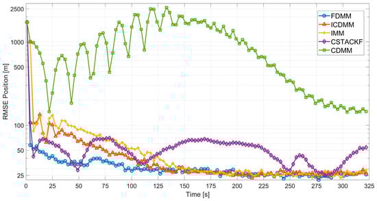 In terms of algorithm precision, the proposed FDMM algorithm exhibited the smallest position and velocity average tracking errors among all the employed algorithms. After the filtering process converged, it showed the smallest RMSE of position tracking, about 25 m, as shown in Table 3, Figure 6 and Figure 7. The CDMM algorithm adopted the UKF in the tracking process, which had poor adaptability. The initial disturbance engendered a more significant impact on the CDMM algorithm, compared to the ICDMM algorithm with the STUKF. Moreover, the wide-ranging lateral maneuver also made the filtering of the CDMM algorithm take a long time to converge, as shown in Figure 6 and Figure 9. For other algorithms, the CDMM algorithm without the STF showed the worst performance. After the filtering finally converged, the ICDMM and IMM algorithms, which adopted the MM method, and combined STF, showed higher filtering convergence precision than the CSTACKF algorithm, which adopted a single model and STF. The results indicated that the integration of the MM method and STFs was effective and exhibited higher performance.
