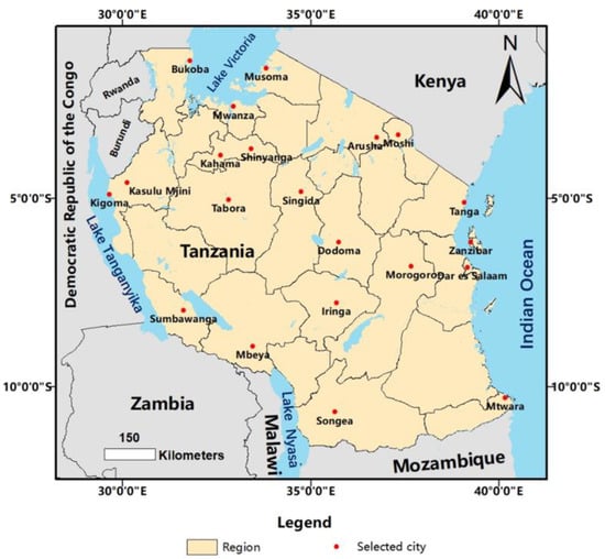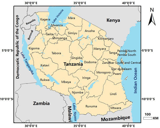 Tanzania is located in Eastern Africa, south of the equator. It is bounded on the north by Kenya and Uganda, on the south by Zambia, Malawi, and Mozambique, on the west by Rwanda, Burundi, and the Democratic Republic of Congo, and on the east by the Indian Ocean. Tanzania is abundant in natural resources such as diamonds, gold, phosphates, and other minerals. Tanzania’s political situation has long been stable, and its economy has grown substantially in recent years. It has been categorized as a lower-middle income country in 2020 [13]. According to the 2012 Tanzania National Census, Tanzania is divided into 30 regions (provinces), 25 of which are on the mainland Tanzania and 5 of which are in Zanzibar (the total number of regions increased to 31 in 2016 after the Songwe region was separated from the Mbeya region). Figure 1 shows the administrative division of Tanzania and its neighbors.
