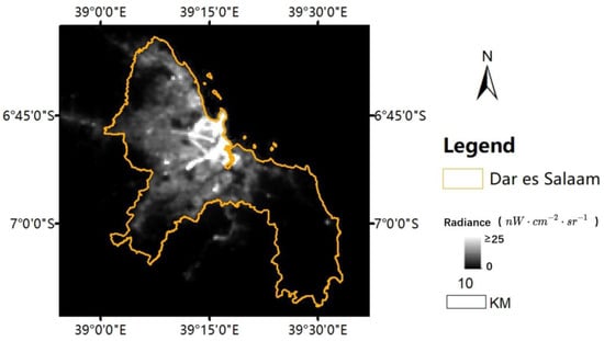 With the development of remote sensing, nighttime light remote sensing provides a new approach for socioeconomic research. The intensity of nighttime light radiance can reflect human socioeconomic activities and has been widely used in studies such as regional development [1,2], electricity estimation [3], and urbanization monitoring [4]. However, the majority of these studies are conducted in strong nighttime light radiation intensity areas [5], whereas only a small part of them focus on regions with a weak nighttime light radiation intensity [6,7,8]. There is a lack of socioeconomic statistics in these low electrification areas. However, according to a research conducted in Burkina Faso [9], most settlements in areas with low electrification rates and a low population density are undetectable to nighttime light sensors. As a result, it is necessary to exercise caution when employing nighttime light remote sensing as a socioeconomic proxy in these areas. Tanzania, a low electrification and data-poor country [10,11], is also in urgent need of socioeconomic assessment to support its sustainable development. However, few studies based on nighttime light remote sensing address Tanzania specifically [12].