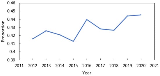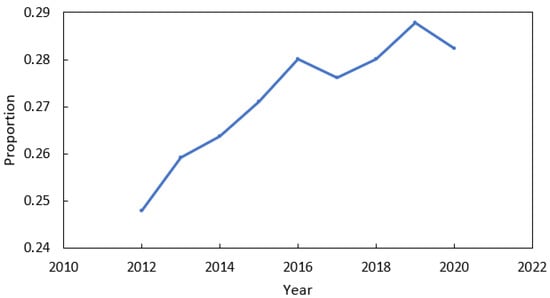 The division result of the northern and southern regions of mainland Tanzania is shown in Figure 6, and the proportion of the total TNL of the southern regions to the TNL of mainland Tanzania excluding Dar es Salaam from 2012 to 2020 is shown in Figure 7. This proportion is around 30%, indicating that the economic size of the south is significantly smaller than that of the north. However, the proportion shows a slight upward trend, indicating that the economic growth rate of the south was slightly faster than that of the north, and that the economic gap between the north and the south was gradually narrowing. This may have benefited from a series of pro-southern policies in recent years, such as upgrading the port of Mtwara [37], a key southern port. In addition, active offshore LPG and gas exploration activities in the south and a significant increase in graphite production in the Lindi region are also likely to contribute to the southern economic boom [38].