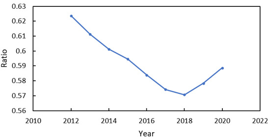 In addition, to investigate the north–south economic disparity, we first divided all regions into southern and northern regions based on the relative north–south position of the regional capitals on the central railway. Because Dar es Salaam has an excessively high GDP [34], including it on either side of the north and south will result in an imbalance in the north–south economic ratio; hence, Dar es Salaam was not included on either side. Then, the ratio of the total TNL of the southern regions to the TNL of mainland Tanzania excluding Dar es Salaam, denoted as , was calculated by the following equation: