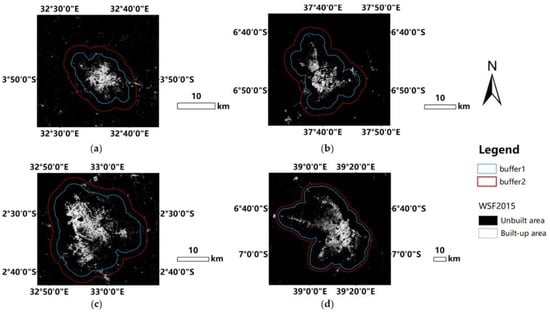 Buffers for some cities: (a) Kahama; (b) Morogoro; (c) Mwanza; (d) Dar es Salaam. Two buffers of different sizes were created for each city. The binary background is the 2015 World Settlement Footprint (WSF2015) layer.