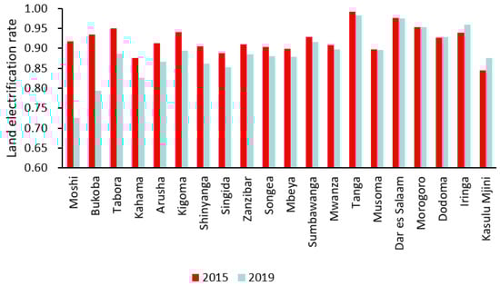 Figure 11 and Figure 12 demonstrate the comparison of the LER in different years within the same group of buffers. The findings from the above figures are as follows: (1) within the same year, most of the 20 cities in either group of buffers had an LER less than 95% in 2015 and less than 90% in 2019, which indicates that there are widespread gaps between urbanization and power infrastructure construction in Tanzania’s major cities; (2) in all but four of the twenty cities, the LER in 2015 was higher than the LER in 2019, indicating that the gaps widened from 2015 to 2019.
