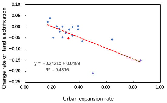 The linear regression results of the urban expansion rate and the change rate of land electrification are shown in Figure 15. The regression analysis showed that urban expansion rate was negatively correlated with the change rate of land electrification, with an of 0.4816 (p < 0.01). Given that the land electrification rate was defined as the proportion of urban built-up area with power infrastructure to the total urban built-up area, the negative correlation indicates that the proportion of the city with power infrastructure decreased with the increase in urban expansion. In addition, the construction of power infrastructure has lagged behind the urbanization.