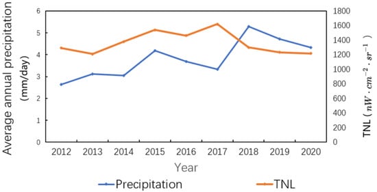 Total nighttime light (TNL) and average annual precipitation of Moshi.