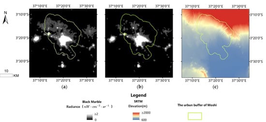 Comparison of the terrain and nighttime light decrease in Moshi. (a) Black Marble data in 2015; (b) Black Marble data in 2019; (c) SRTM DEM data.