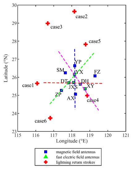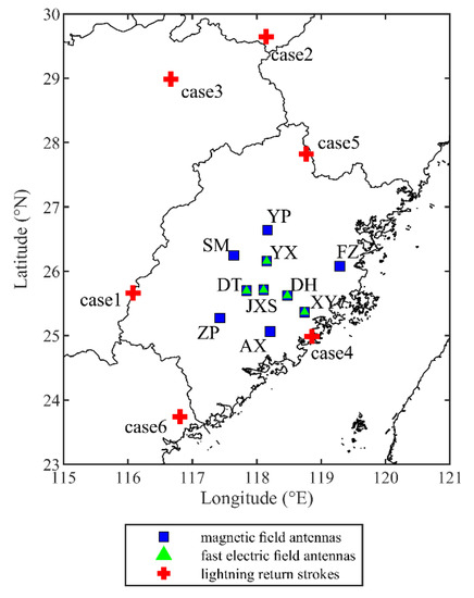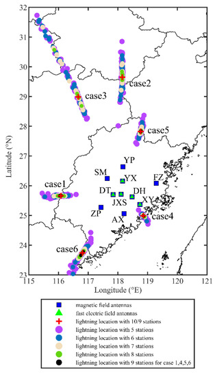 The lightning detection and location network was under stable operation during the summer of 2021. Figure 2 shows the sensor locations within the lightning location network in Fujian Province. Other stations were installed below an elevation of 250 m, except JXS (1667 m) and DH (1654 m) stations. In order to analyze the effect of number and configuration of participating stations on the quality of the lightning location outside the network, six cases from different directions were chosen. The red crosses mark the six cases whose position is estimated by using the ToA technique with the time corresponding to the peak field, using 10 stations’ (9 stations for case 2 and case 3) simultaneous waveforms data. The distances of the six cases to each station are about 220 km, 430 km, 400 km, 120 km, 240 km and 270 km on average, respectively.