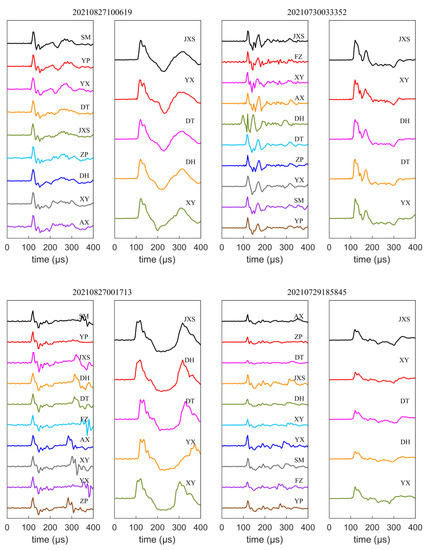 The recorded synchronous waveforms of lightning return strokes corresponding to six cases in Figure 2. The left part in subgraph shows the magnetic field waveform. The right part is the electric field waveform of the same case.