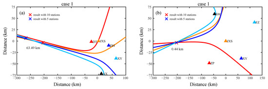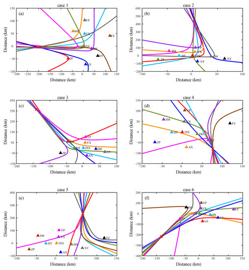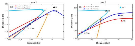 Figure 8 shows the worst and best configurations corresponding to the maximum and minimum deviation distance. The value of these deviation distances for six cases is shown in Table 1. The left-side subplots describe the worst configurations for six cases. It was found that three participating stations approximately lied on a straight line, and the direction of the line is consistent with the direction of the case relative to the network. The linear configuration of three stations results in their hyperbolas being almost parallel to each other. The intersection region consisting of these almost parallel hyperbolas became narrow and long, not tight and focused on a point. In this situation, the fifth station was critical for finding the location where the minimum chi-square value was, using the least square method. The location was found at the intersection of the narrow long region and the hyperbola corresponding to the fifth station and significantly deviated from the reference location. For example, in Figure 8a of case 1, AX is the center station. DT, JXS and DH lay approximately on an east–west line, whose direction is the same as that of case 1 relative to the network. The red, yellow and blue hyperbolas corresponding to these three stations intersect and form a narrow long region. The cyan hyperbola corresponding to the fifth station XY intercepts this region, and their intersection (Figure 8a, blue cross) is the location under this configuration of five stations, being 63.49 km away from the reference location (Figure 8a, red cross).