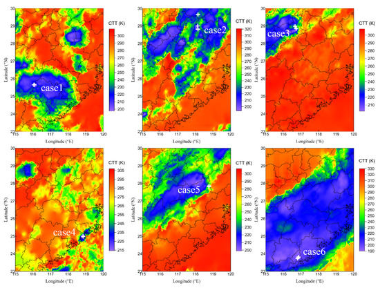 Figure 5 shows the reference locations of six cases estimated by the ToA technique with three methods of arrival time differences. The background is cloud top temperature (CTT) detected by the advanced geosynchronous radiation imager (AGRI) equipped by FY4A [45,46]. CTT was used in this study to investigate the development of convective clouds [47]. It can be seen that the reference locations are in the area of low CTT (i.e., strong convection), whatever the method of arrival time differences is. This strong dependence on the low CTT region provides convincing evidence that the reference locations are reasonable, although the exact lightning locations are unavailable. Due to the further propagation for case 2 and case 3, the arrival time determined by the two definitions (tp and t10) have certain differences. This difference was passed to the arrival time differences and finally affected the reference location result without affecting its validation.