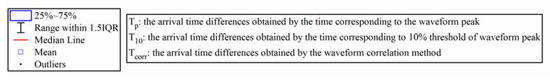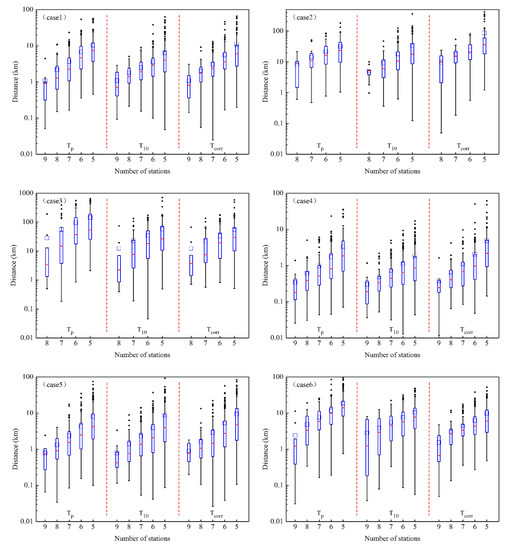As mentioned in Section 2.2, three methods of arrival time differences were used to determine the lightning location, marked as Tp, T10 and Tcorr. The goodness-of-fit parameter χ2 is minimized when the lightning location is estimated, and the typical timing error σ2 in (2) was set to 1 μs [5,21]. As the number of synchronous magnetic field antennas was nine in case 2 and case 3, the maximum number of participating stations was eight, while the others were nine. The minimum number was five, because there are four unknowns in the non-linear equations. The locations are eliminated when its chi-square value was greater than 5 to avoid time gross error on the arrival time. Only the locations which pass the test could be compared with the reference location in the form of boxplots.