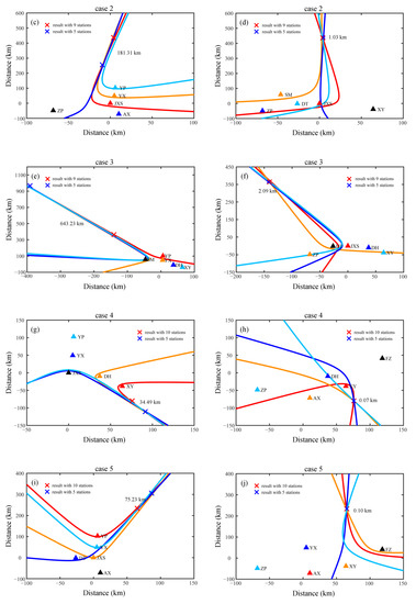 The right-side subplots describe the best configurations for six cases. It is the more dispersed distribution of the participating stations that leads to the minimum deviation distance. The best configurations mean that no station lie on a straight line, at least on a line whose direction is the same as that of the case relative to the network. The narrow, long region mentioned in the last paragraph does not exist. The intersection region consisting of four hyperbolas is tight for all six cases. In Table 1, when the distance to each station is less than 270 km on average (i.e., case 1, 4, 5, 6), the minimum deviation distance is less than 1 km. When the distance to each station is about 430 km and 400 km on average (i.e., case 2, 3), the minimum deviation distance is 1 km and 2 km, respectively. It shows that under a specific configuration, the network consisting of five stations has the same performance as the network containing ten or nine stations, considering the deviation distance is less than 1 km.