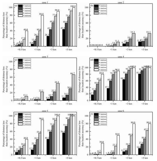The percentage of deviation distance less than the specific location accuracy for six cases with different number of participating stations. (a–f) correspond to the results of case 1 to case 6.