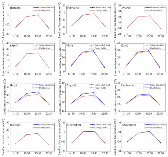 | Surface temperature difference between saline–alkali land and paddy fields (°C) | ||||||||||||||