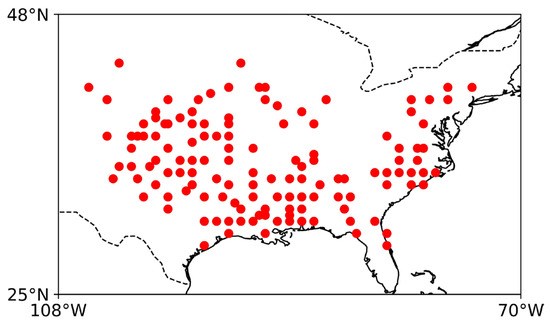 The 3D gridded radar reflectivity data used in this study were collected by the U.S. NEXRAD WSR-88D radar network and obtained from the ds841.6 dataset product of the National Center for Atmospheric Research (NCAR) Research Data Archive [39]. Limited by storage and GPU consumption, radar observations of 155 severe storm events in 2013–2019 with a longitude and latitude grid size ranging from 480 to 576 were selected from different geographical coverage (Figure 1).