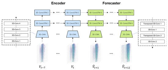 As shown in Figure 2, the proposed 3D-ConvLSTM model follows the encoder–forecaster architecture [21].