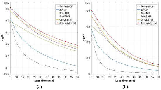 Figure 3a,b show the CSI35 and CSI45 curves against different lead times in 0–1 h for the grid radar volumes obtained by the six models, respectively. As can be seen, the nowcasts obtained by the Persistence and 3D optical flow methods obtained the lowest and second-lowest CSI scores for both thresholds and nearly all lead times, respectively, because these methods use relatively constant 3D motion vectors (zero vectors for Persistence) to advect storm echoes, which leads to difficulty when forecasting convective storms with changing morphology, intensity, and motion. Among the four DL-based nowcasting models, the performance of 3D-UNet in terms of CSI35 lagged behind that of the other three methods, which may be due to its limited ability to model time. The PredRNN method achieved better CSI35 scores for early nowcasting compared to the ConvLSTM technique; however, its performance deteriorated more than the latter for lead times after 10 min. In contrast, the proposed 3D-ConvLSTM achieved the best CSI35 scores for all lead times. For a more challenging task, i.e., nowcasts of storm echoes above 45 dBZ, we found that the performance of all models decreased significantly with increasing lead times. Over time, the nowcasting performance of the 3D-UNet, PredRNN, and ConvLSTM methods gradually became comparable. In contrast, the proposed 3D-ConvLSTM maintained competitive performance for all lead times.