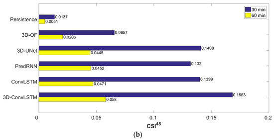 In addition, the CSI35 and CSI45 scores computed for the nowcasts obtained by the six models for lead times of 30 and 60 min are shown in Figure 4a,b, respectively. As can be seen, the proposed 3D-ConvLSTM exhibits clear superiority. It achieved higher CSI35 scores with relative improvements of 4.9% and 6.8% over those of ConvLSTM for lead times of 30 and 60 min, respectively. In addition, the CSI35 score of the proposed method was greater than 0.29 for a lead time of 60 min. In terms of the prediction of storm echoes over 45 dBZ in both 30 and 60 min nowcasts, the proposed method improved the CSI scores of ConvLSTM by 20.3% and 23.1%, respectively.