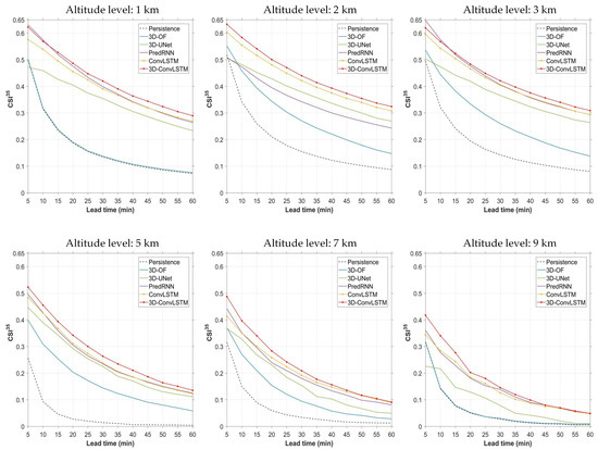 CSI curves of the compared 3D REE models at 45 dBZ for six different altitude levels (1, 2, 3, 5, 7, and 9 km).