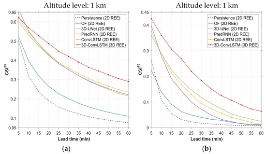 The 1 km CAPPI reflectivity data usually correlate highly with ground-level rainfall. Here, we go a further step to compare the nowcasting performance of some 2D REE models described in Section 4.1 and the proposed 3D REE model for 1 km altitude level using the CSI metric at 35 and 45 dBZ thresholds. The results are shown in Figure 7a,b. It can be seen that the optical flow method was superior to the Persistence with the help of advection field. Consistent with the results of the above 3D REE experiments, when used for the 2D REE task, the ConvLSTM and PredRNN models still outperformed the 3D-UNet model due to their explicit temporal modeling ability. Most importantly, the proposed 3D REE model showed significant improvements over the above 2D REE models for the convective storm nowcasting at a 1 km altitude level for both thresholds. The reasons are as follows. First, the proposed 3D-ConvLSTM model exploits multi-altitude reflectivity images, which can provide additional information of vertical profile and dynamics of convective storms compared to 1 km CAPPI reflectivity images. Second, the design of the proposed model makes it capable of effectively modeling the 3D spatial–temporal evolution of convective storm systems. Benefiting from these two advantages, the proposed 3D-ConvLSTM model can bring the convective echoes at higher altitudes to the 1 km altitude level and predict the radar echo evolution at this vertical level more reasonably.