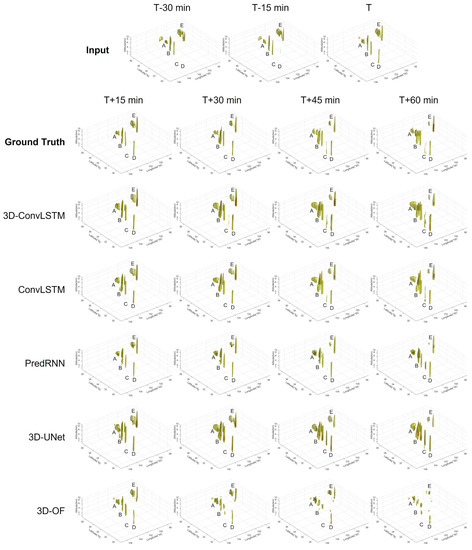 Figure 8 shows the first representative case at a forecasting time of T = 7 May 2019, 21:20 UTC. From the input and ground truth of observations, we found that a storm cell located in Region A gradually split into two cells in the next hour from T, and the storm cells in Region B became dense. In Region C, storm initiation (radar echo intensified from <35 dBZ to reflectivities of ≥35 dBZ) occurred after T + 30 min, and three storm cells were finally developed at T + 60 min. As can be seen, a storm cell was generated in Region D before T and moved south in the next hour, and the storm cells in Region E moved east and out of the observed area. By comparing the nowcasting results obtained by the compared models, we found that the 3D optical flow method successfully captured the movements of the storm cells in Regions and E; however, it failed to predict the development of the other storms in Regions A, B, and C. Note that the motion vector in the vertical direction caused uneven displacement for some echoes, which resulted in a breakage phenomenon (especially for longer lead times). In contrast, the DL-based models achieved more informative and skillful nowcasts. In addition to forecasting correct movements, all DL-based models predicted the storm initiation and development in Regions B and C effectively. However, some false signals were produced. For example, the 3D-UNet method overestimated the storm intensity in Region B and underestimated the storm intensity in Region E for the 60 min nowcast. In addition, all models completely failed to predict the splitting process of the storm cell in Region A. Nevertheless, we found that the proposed 3D-ConvLSTM produced more realistic nowcasts. Note that the 60 min nowcast obtained by the proposed method exhibited more reasonable distribution of the storms in Region B and provided the correct number and shape of the storms initiated in Region C.