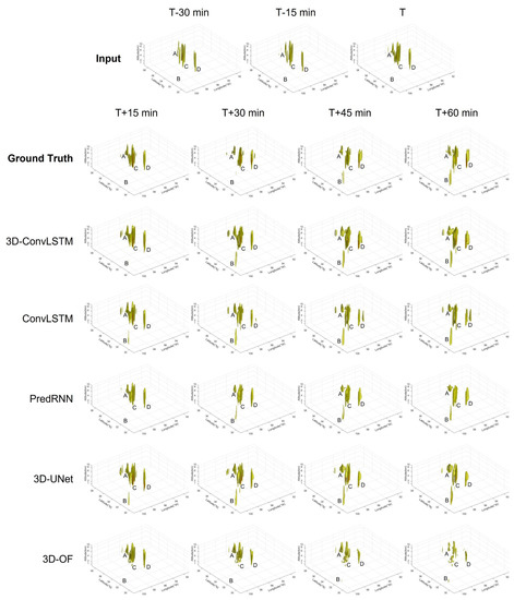 Generally, we consider that 3D convective storm nowcasting has broad research potential and various application prospects. Considering the trade-off between GPU memory cost and efficiency of 3D feature extraction, for nowcasting of high-resolution grid radar volumes, it is necessary to employ a 3D-CNN to perform 3D-down-sampling or 3D-up-sampling while maintaining sufficient vertical information. Thus, more advanced 2D-LSTM units can be extended into 3D versions to perform 3D spatial–temporal extrapolation. It is noted that in the absence of polarimetric parameters, the proposed method is not able to identify the melting layer, the phase of precipitation, or leverage the information about the dynamic structure of storms, which is a clear limitation. We have noticed that some polarimetric radar variables, e.g., differential reflectivity , can provide additional information about convective evolution. A preliminary attempt has been made to implement multi-altitude into a 3D-UNet-based model to realize precise 3D storm nowcasting. In the future, we plan to focus on more efficient three-dimensional extrapolation models and continue to explore the feasibility of multivariable fusion to further improve the performance of 3D nowcasting.
