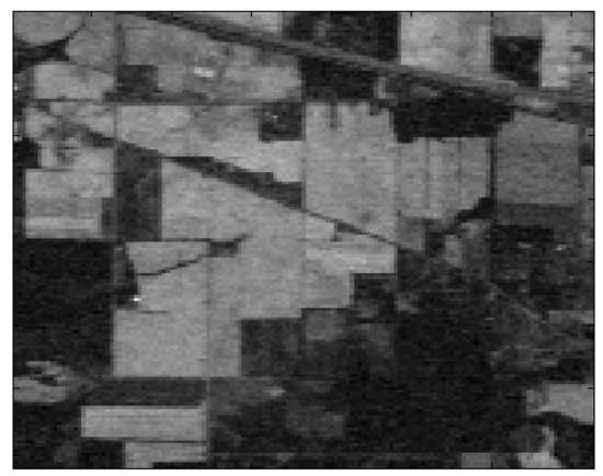 The Salinas dataset includes hyperspectral data of images of Salinas Valley, California, made using an imaging spectrometer (AVIRIS) sensor, with a total of 224 bands, generally excluding 20 bands affected by noise. The remaining 204 bands are the research object of this study. The size of these data is 512 × 217, comprising a total of 105,984 pixels. There are a total of 54,129 pixels containing 16 types of ground objects. Figure 4 shows a sample band from the Salinas dataset.