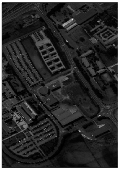 The Pavia University dataset includes hyperspectral data of images of Pavia City, Italy, made using an imaging spectrometer (ROSI) sensor in 2003, with a total of 115 bands, generally excluding 12 bands affected by noise. The remaining 103 bands are the research object of this study. The size of these pieces of data is 610 × 340, making a total of 2,207,400 pixels. There are a total of 42,776 pixels containing nine types of ground objects. Figure 3 shows a sample band from the Pavia University dataset.