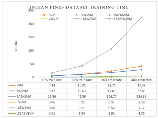 Figure 5 shows our solution time comparison of the SVM, TWSVM, BAENSVM, LSSVM, LSTWSVM and LSBAENSVM algorithms under the conditions of the usage of 10%, 20%, 30% and 40% of the Indian Pines training dataset. The indicated times are the average values of ten runs.