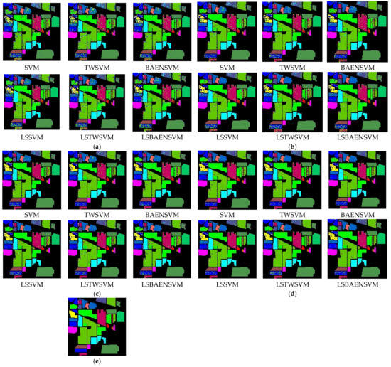Table 2 shows the experimental accuracies of the six classification models. Figure 6 is a restoration diagram of the specific classification results of the experimental results in Table 2. Figure 6 shows that LSBAENSVM has fewer classification errors than the other algorithms in the four sets of experiments. From Table 2, to specifically analyze the experimental results, it can be seen that LSBAENSVM achieved the best classification results on the Indian Pines dataset. Compared with the BAENSVM model, when each class uses 10%, 20%, 30%, and 40% of the training data, the OA of LSBAENSVM is 0.63%, 0.45%, 0.39%, and 0.29% higher than that of BAENSVM, respectively, while the Kappa coefficients are 1.34%, 1.17%, 0.62%, and 0.69% higher than those of BAENSVM, respectively. The classification accuracy of the BAENSVM model is better than those of SVM and TWSVM. For example, using 10%, 20%, 30%, and 40% of the training data of, the OA of BAENSVM is 0.42%, 0.51%, 0.38%, and 0.42% higher than that of SVM, respectively, and the Kappa coefficients are 0.54%, 0.64%, 0.48%, and 0.48% higher than those of the SVM. This is because the BAENSVM algorithm is a nonparallel support vector machine constructed on the basis of an SVM. Under certain conditions, it can degenerate into an SVM, although the classification result must be better than that of an SVM. However, TWSVM only minimizes the empirical risk, which affects the classification accuracy, so the classification result is poor. While the LSSVM also achieves good classification results, LSBAENSVM has better classification accuracy. The OA is 0.1%, 0.15%, 0.17%, and 0.11% higher than that of SVM. Compared with the relationship between the BAENSVM and SVM, the LSBAENSVM is theoretically a nonparallel support vector machine based on an LSSVM but with better classification accuracy.