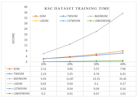 Figure 7 shows a solution time comparison of the SVM, TWSVM, BAENSVM, LSSVM, LSTWSVM and LSBAENSVM algorithms when using 10%, 20%, 30%, and 40% of the Kennedy Space Center training dataset. The indicated times are the average values of ten runs.