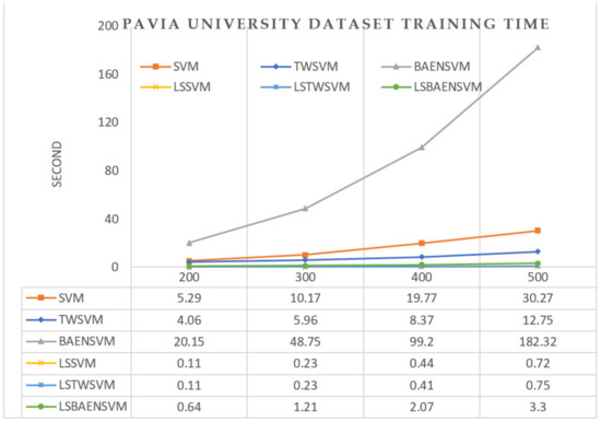 Figure 11 shows a solution time consumption of SVM, TWSVM, BAENSVM, LSSVM, LSTWSVM, and LSBAENSVM based on the four groups of experiments. When the value of each category is the same as that of Pavia dataset, the classification category is increased to 16 categories, which makes finding the solution more difficult. When the training datasets of each category comprise 200, 300, 400 and 500 data points, the solution time of BAENSVM is 70, 184, 301, and 494, respectively. Under these circumstances, model training becomes more difficult. SVM and TWSVM have faster solution speeds than BAENSVM because of their small data size, but they also require more time. The introduction of the least square idea greatly improves the speed of the algorithm. It is obvious that the time requirements of LSSVM, LSTWSVM, and LSBAENSVM are far from those of SVM, TWSVM, and BAENSVM. The solution time of LSBAENSVM is 37, 44, 46, and 48 times faster than that of BAENSVM, which further verifies the efficacy of the algorithm with the least square approach.