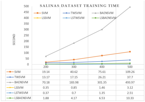 Figure 11 shows a solution time comparison of the SVM, TWSVM, BAENSVM, LSSVM, LSTWSVM, and LSBAENSVM algorithms under the four groups of Salinas experiments. The selected times are the average of ten runs.