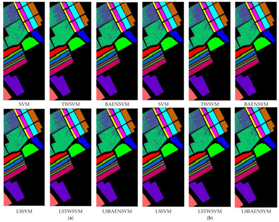 Table 8 shows the experimental accuracies of the six classification models. Figure 12 is a restoration diagram of the specific classification results of the experimental results in Table 8. Figure 12 shows that the LSBAENSVM has fewer classification errors than the other algorithms in the four sets of experiments. From Table 8, it can be seen that LSBAENSVM achieves the best classification results on the Salinas dataset. Compared with the BAENSVM model, the OAs of LSBAENSVM are 0.56%, 0.56%, 0.44%, and 0.42% higher than those of BAENSVM when 200, 300, 400, and 500 training data are taken for each class, respectively, and the Kappa coefficients are 0.56%, 0.55%, 0.49%, and 0.46% higher than those of BAENSVM. Compared with LSSVM, the OAs of LSBAENSVM are 0.35%, 0.35%, 0.29%, and 0.20% higher than those of LSSVM, and the Kappa coefficients are 0.40%, 0.39%, 0.30%, and 0.26% higher than those of BAENSVM. Because LSBAENSVM is equivalent to the improvement of a nonparallel support vector machine based on LSSVM, it invariably obtains classification accuracies which are superior to those of LSSVM.