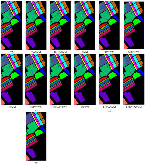 Table 8 shows the experimental accuracy of the SVM, TWSVM, BAENSVM, LSSVM, LSTWSVM, and LSBAENSVM methods when using the Salinas dataset. The best experimental results are shown in bold.