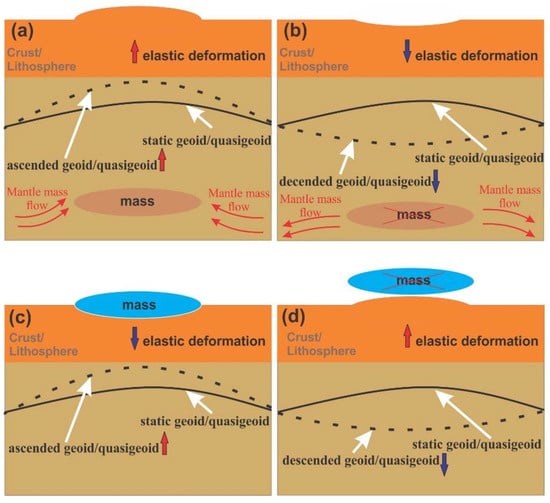 The relation between temporal mass variations within the Earth’s system (TMVES), geoid/quasigeoid height changes, and the elastic deformation of the Earth’s surface in the up component. (a) the mass under the geoid/quasigeoid surface increases, (b) the mass under the geoid/quasigeoid surface decreases, (c) the mass on the Earth’s surface increases, and (d) the mass on the Earth’s surface decreases.