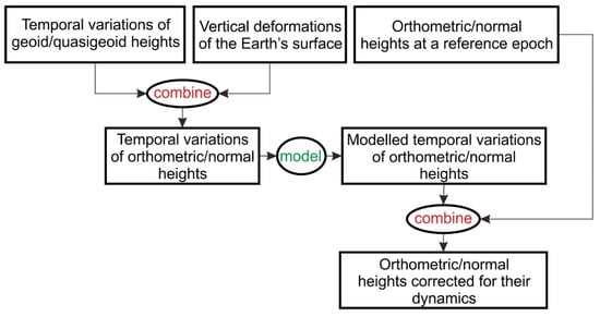 Flowchart describing the general steps to determine orthometric/normal heights corrected for their dynamics.