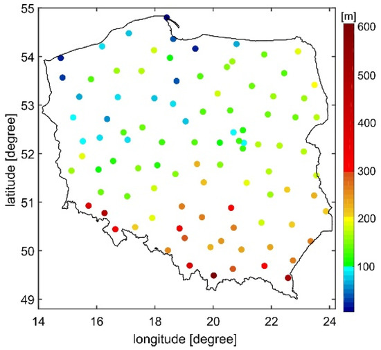 In this study, H(t0)/H*(t0) from the ASG-EUPOS network sites were utilized. The values of normal heights referred to the Kronstadt86 vertical datum for the territory of Poland (PL-KRON86-NH) are accessible via the ASG-EUPOS website (http://www.asgeupos.pl/index.php accessed on 1 August 2022). These normal heights were transformed into the PL-EVRF2007-NH (European Vertical Reference Frame 2007 recently applied for the area of Poland). The reference epoch t0 of PL-EVRF2007-NH is 1 January 2008, which corresponds to its realization epoch [45]. The PL-EVRF2007-NH is based on results of the adjustment of the 4th levelling campaign in Poland (1998–2012), EUVN (European Vertical Reference Network), and EUVN-DA (European Vertical Reference Network-Densification Action) solutions as well as solutions for the benchmarks of eccentric points of permanent GNSS stations of the ASG-EUPOS network. Heights are given in the zero tidal system. The accuracy of levelling measurements was estimated as 0.74 mm/km. Based on the adjustment of the levelling network, the estimated accuracy of a single benchmark is 3.5 mm [46].