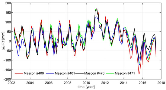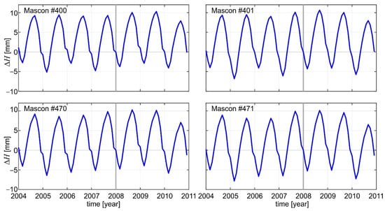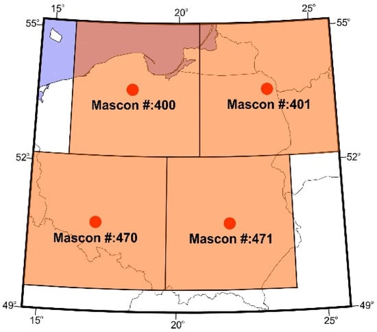 The territory of Poland was divided into equal area blocks of a size equivalent to the spatial resolution of GRACE data, i.e., ~334 × 334 km2 or 3° × 3° on the equator. Those equal area blocks are localized in the same configuration as the Jet Propulsion Laboratory (JPL) mascons (mass concentrations), global 3° × 3° equal area spherical cap mascon solutions. Figure 4 shows the area investigated, including the location of four mascons used. The main TMVES over this area can be ascribed to temporal hydrological mass variations [28]. Temporal variations of equivalent water thickness over –t0 at the location of those mascons obtained from monthly release 06 (RL06) JPL GRACE mascon solutions using the mascon visualization tool (cf. https://ccar.colorado.edu/grace/index.html, accessed on 1 August 2022) are depicted in Figure 5.