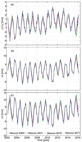 The , as well as , were estimated at the location of mascons (cf. Figure 4) using monthly CSR (Computation Centre of the University of Texas Center of Space Research) RL06 GRACE-based GGMs [48], LLN calculated using the preliminary reference Earth model (PREM; [49]), and the IGiK–TVGMF (Instytut Geodezji i Kartografii–Temporal Variations of Gravity/Mass Functionals; [50]) software. The degree-1 and degree-2 harmonic coefficients from the solution described in Swenson et al. [51] and the corresponding ones obtained from satellite laser ranging (SLR) [52], respectively, replaced those of CSR RL06 GRACE-based GGMs. In order to reduce the noise included in CSR RL06 GRACE-based GGMs, the decorrelation filter DDK3 [53] was utilized. This filter was chosen as it compromises between reducing the noise and keeping the signal over the area investigated [29]. Moreover, those GGMs were truncated at d/o 60 that corresponds to the spatial resolution of the mascon grid (Figure 4) and the DDK3 filter. Then, were estimated as a sum of detrended , detrended , and the linear trend (i.e., secular variations) of H/H* obtained from the NKG2016LU model [54]. The resulting , , and for the period April 2002–August 2016 are depicted in Figure 6.