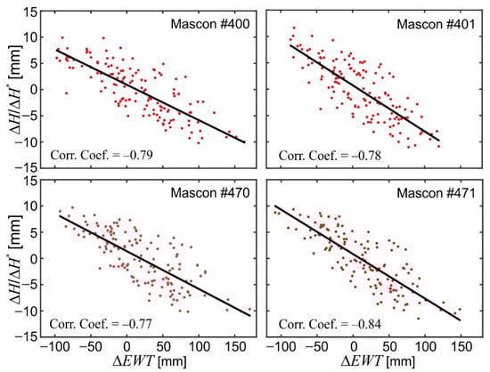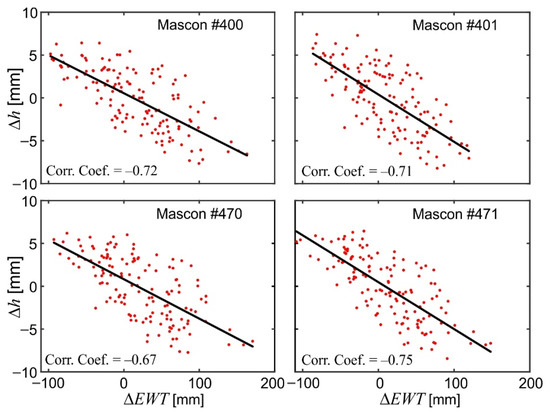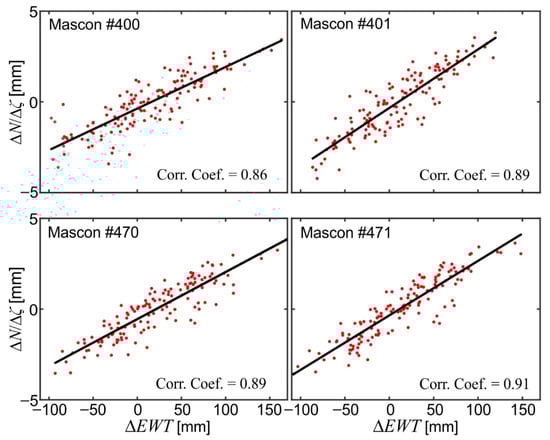 Figure 6 exhibits a clear seasonal pattern of , , and . The maximum values of were obtained at the beginning of spring (in February–April) and minimum values at the end of summer/beginning of autumn (in August–October); they are consistent with the corresponding ones estimated by Krynski et al. [28] and Godah et al. [29,30,32]. For , maximum values were obtained in August–October and minimum values in February–April, which correspond to minima and maxima of , respectively. For a subarea, the dispersions of and reach 8 mm and 17 mm, respectively. Minimum and maximum values of , obtained as the combination of and , were observed in February–April and in August–October, respectively. The for the same subarea reach up to 23 mm, and 4 mm from one subarea to another at the same epoch. The results presented in Figure 6 also indicate that approximately 66% of the signal is due to Δh, while the remaining part of this signal is induced from ΔN/Δζ. The coefficients of correlation between (cf. Figure 5) and , , and are presented in Figure 7, Figure 8 and Figure 9, respectively, showing strong correlations between water mass changes and ΔN/Δζ as well as Δh. The correlations between and are slightly stronger (correlation coefficients of 0.89 ± 0.02) compared to those between and , characterized by correlation coefficients of −0.71 ± 0.04. This might be due to the fact that N/ζ is basically associated with the disturbing potential generated from the Earth’s mass distribution, while the vertical deformations of the Earth’s surface may depend on other factors, e.g., the elasticity of the Earth’s crust. Overall, the results obtained reveal that the resulting ΔH/ΔH* are strongly correlated with ΔEWT (correlation coeffiecients of −0.80 ± 0.04).
