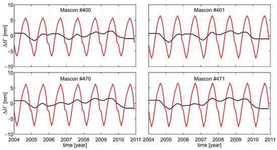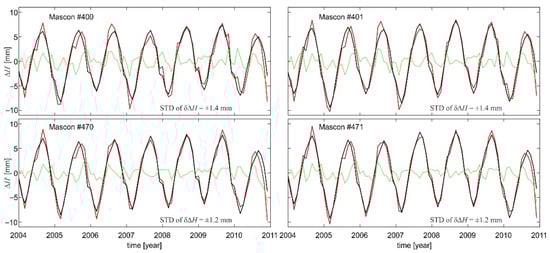 The ∆HSD(t)/∆H*SD(t) models are centered to zero (see Figure 11). Thus, in order to determine ∆HM(t)/∆H*M(t), the ∆HSD(t)/∆H*SD(t) had to be referred to the reference epoch t0, i.e., 1 January 2008, that has been used as the realization epoch of orthometric/normal heights. In this study, ∆HM(t)/∆H*M (t) were determined by shifting those ∆HSD(t)/∆H*SD(t) considering the offset (τ) that is equal to: 1.9 mm, 1.9 mm, 2.6 mm, and 2.0 mm for the mascons #400, #401, #470, and #471, respectively (see Figure 12).