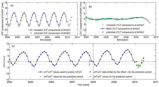 In order to mitigate the effect of the gaps in data from the GRACE/GRACE–FO satellite missions and the latency of GRACE/GRACE–FO products, prediction of the ∆HM/∆H*M values for months where these products are unavailable, would be required. Within this study, the prediction of ∆HM/∆H*M values were investigated using the empirical approach proposed in Godah et al. [29] based on the results obtained from the SD method. The predicted values of ∆HM/∆H*M were calculated as a sum of the S(t)/S*(t) component and the ∆H/∆H* values obtained from an appropriate mathematical model fitted to LT(t)/LT*(t) component.
