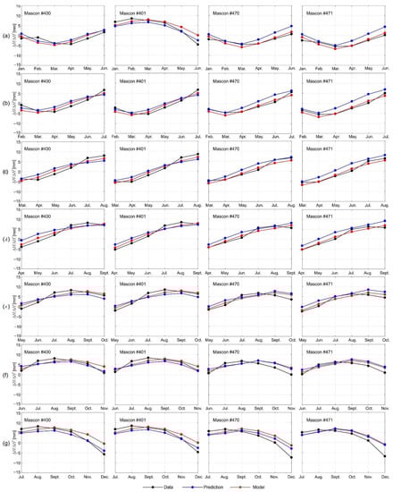 The GRACE/GRACE–FO level 2 products, i.e., GGMs or mascon solutions, are generally available with a latency of a couple of months from taking measurements by the GRACE/GRACE–FO satellites. Thus, ∆HM/∆H*M obtained from these products for the present time should be predicted. With the use of ΔHc/ΔH*c data from 6 years preceding the prediction period, S/S* and LT/LT* components of ∆H/∆H* were determined with the SD method. Several mathematical models, e.g., exponential models, Fourier series, Gaussian models, polynomial models, and sum of sines models, were investigated for their fit to the LT/LT* component of ∆H/∆H* using Matlab [55]. The 7th degree polynomial model was chosen as the best fitted one. The predicted values of ∆HM/∆H*M were determined by combing (1) S/S* component of ∆H/∆H*, (2) values of ∆H/∆H* resulted from the 7th degree polynomial model fitted to LT/LT* component of ∆H/∆H*, and (3) the offset (τ).